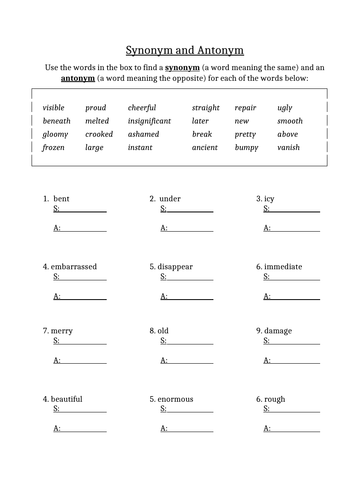 Synonyms And Antonyms Worksheets Pdf Study Guide from 391795-1232725-raikfcquaxqncofqfm.stackpathdns.com 1) bobby was looking for the correct answer to this problem. Synonyms and antonyms decide if you are looking at a pair of synonyms or a pair of antonyms. These two words have opposite meanings. 100%(1)100% found this document useful (1 vote). In the early years, easy antonyms are introduced, e.g., hot/cold and happy/sad. The intent is to increase vocabulary and provide writing practice. Synonyms, antonyms & homonyms song lyrics: Since your browser does not accept 3rd party cookies , the system does not work as expected and captcha will be requested every time.